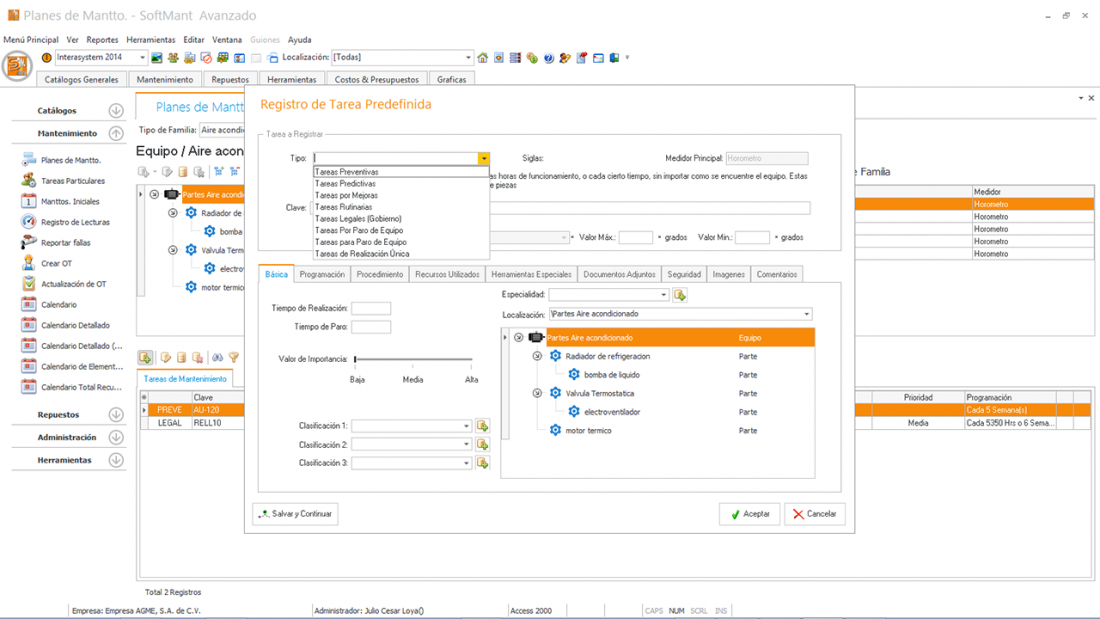 Con SoftMant2 se puede generar diferentes tipos de tareas para poder llevar nuestro mantenimiento lo más detallado posible, a continuación enlistamos los tipos de Tarea que tiene.